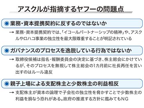 ヤフーが7月17日、連結子会社であるアスクルの岩田彰一郎社長の再任に反対すると発表してから1週間が経過した。アスクルは7月18日に岩田社長や取締役3人が記者会見で、ヤフーの手法を批判。同23日は社外役員で結成している独立役員会がヤフーの不当性を指摘する記者会見を行った。アスクルはヤフーに業務・資本提携の解消を求める協議を申し入れているが、ヤフーは協議には応じず、同24日には、岩田社長の再任に反対する議決権を行使したと発表した。このままでは岩田社長の退陣は不可避であり、ヤフーの実効支配体制となる。岩田社長のみに退陣を求めるヤフーの本当の狙いについて分析する。