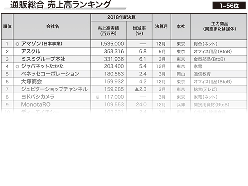 アマゾンが2位に1兆円以上の差をつけて首位を独走している。ランキング表には、マーケットプレイスの出品手数料などを含む日本事業の売上高を掲載したが、直販事業と出品事業ともに大きく成長しているとしている。直販事業と出品事業を合わせた流通総額は、2兆円を超える規模に成長しているとみられる。