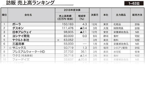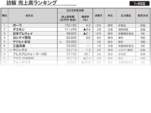 【訪販実施企業 2018年度 売上高ランキング】 255社合計は1兆7727億円/上位100社の成長率は10.4%プラスに