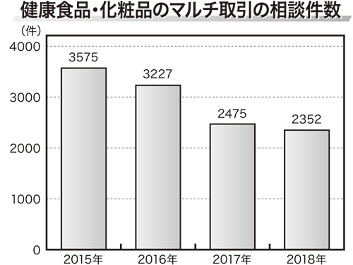 訪問販売・通信販売・マルチ取引の相談件数が軒並み減少している=下グラフ参照。本紙がこのほど行った、PIO―NET(パイオネット)の18年度相談件数に関する調査で明らかになった。通販では、総件数が減少している中、「定期購入」関連の相談が依然として増加していることが分かった。訪販では、蓄電池特需に沸く太陽光発電訪販の相談件数が、むしろ減っていた。マルチ取引では、ネットワークビジネスの主力商品である「健康食品」「化粧品」の相談がここ数年で激減していることが分かった。本紙はこのほど、国民生活センター(以下、国セン)が8月8日にまとめた「2018年度のPIO―NETにみる消費生活相談の概要(以下概要)」の情報をもとに、さらに詳細な分析を行った。