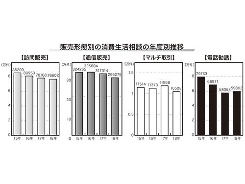 一方で、電話勧誘販売の18年度の相談件数は増え、前年度比1749件増の5万9802件となった。「電力の小売り自由化」に関連する、電力プランの切り替えの営業に関する相談が前年度比2918件増の4864件になったことが影響した。