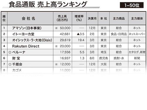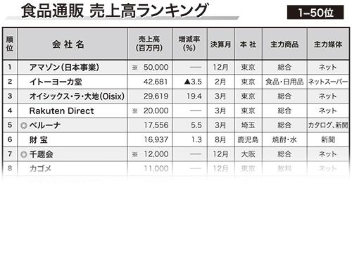 【2018年度 食品通販売上高ランキング】 〈食品通販売上高調査〉実質成長率は11.1%/100社合計売上高は4259億円