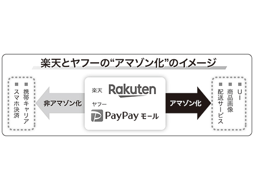 楽天やヤフーは、ECモールのユーザーインターフェイス(UI)や配送において、”アマゾン化”を進めている。「楽天市場」やヤフーが新設した「PayPay(ペイペイ)モール」では、「アマゾン」のように商品画像の背景を白抜きに統一するように促しており、「アマゾン」に負けない配送サービスを目指した品質向上策を講じている。ECに不慣れなリアルからの新規顧客の流入増加や、スマホがメインチャネルとなっていることを受け、UIや配送において、「アマゾン」のようなシンプルで機能的なサービスを目指す。”アマゾン化”は「アマゾン」に負けないための守りの戦略といえる。一方、攻めのポイントは、アマゾンが積極的に参入しない、”携帯キャリア”や”スマホ決済”の領域にある。楽天とヤフーは出店者の理解を得て、いかに”アマゾン化”を進められるかも勝負の鍵となりそうだ。