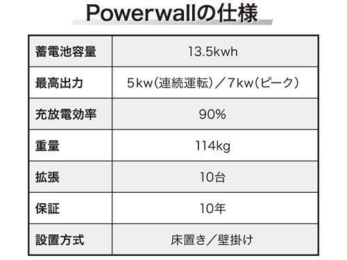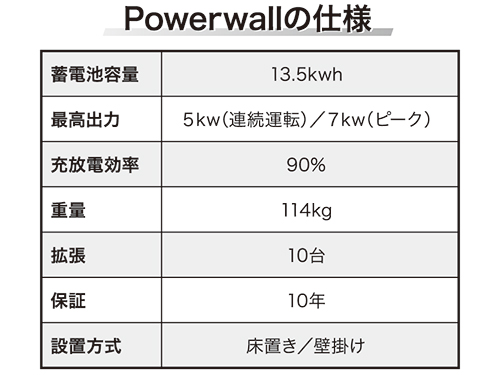 テスラが販売する家庭用蓄電池「パワーウォール」は全負荷型と呼ばれるもので、事前に決めた電気の回路にだけ供給する特定負荷型の蓄電池とは異なる。停電時は、家全体に電力を供給することができるタイプの蓄電池で、家電製品やエアコンなどの高い出力の電力を必要とする200Vにも対応している。電池はリチウムイオン電池を採用している。