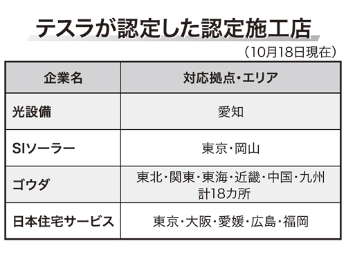 10月18日にテスラの認定施工会社に認定された日本住宅サービス(本社広島県、有吉彰英社長)では、パワーウォールの問い合わせがすでに寄せられ、数件成約したという。