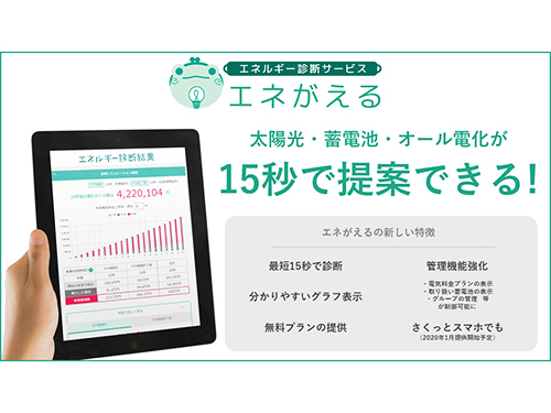 今回アップデートしたのは(1)無料プランが利用できる(3顧客までデータ保存可能)(2)シミュレーションにかかる診断時間を5分から最短15秒で診断(3)操作画面を対話型(タブレットを顧客に見せながら提案可能)(4)電力料金プランや蓄電池の事前登録が可能─の四つ。20年1月以降は提案書の自動生成やスマートフォンで診断ができるサービスも追加していくという。