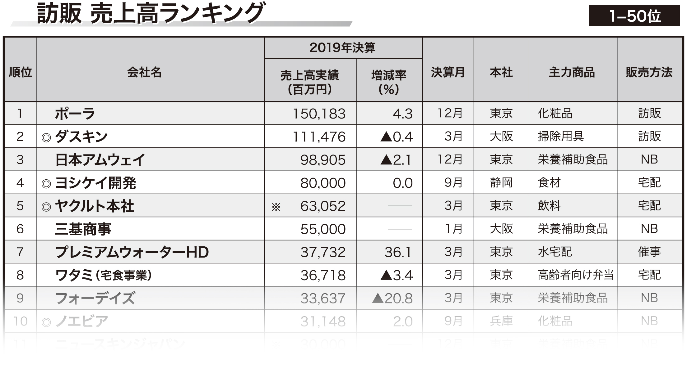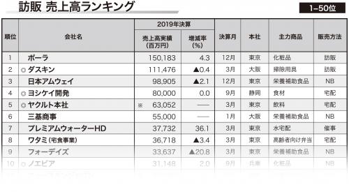 日本流通産業新聞はこのほど、訪問販売(サロン販売・催事販売・ネットワークビジネスなどを含む)を実施している企業を対象に売上高調査を実施した。ランキング化した259社の合計売上高は1兆7471億7800万円だった。前年調査と比較した120社の成長率は2.4%のプラス成長になった。蓄電池の好景気や災害需要などを要因に、太陽光・リフォーム訪販企業が軒並み増収した。ランキングに掲載した注目企業には、インタビューし、19年の成果や20年に向けた展望を聞いた。