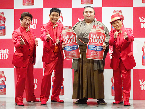 ヤクルト本社は19年12月19日、都内で「Yakult(ヤクルト)1000」の新CMキャラクターに大相撲の大関貴景勝を起用すると発表した。同日、都内で新CMキャラクター発表会を開催、お笑いトリオのダチョウ倶楽部が参加した。