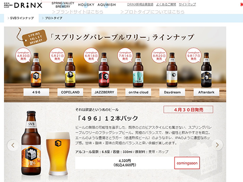 同社は、14年9月にクラフトビール「スプリングバレーブルワリー496プロトタイプ」をECで発売し、クラフトビール事業を試験的に開始した。同商品は3000~4000本の限定生産を行っていたが、計3回の発売のたびに予約開始から1~2日で売り切れていたという。