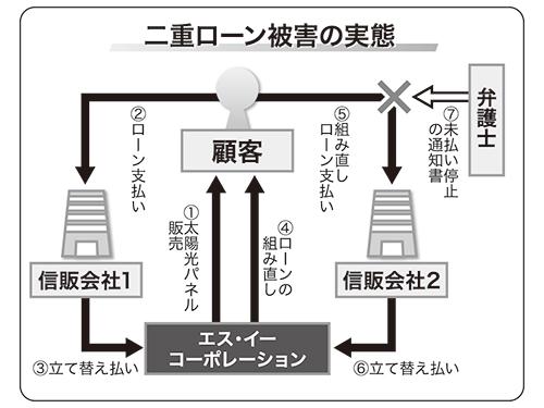 被害者は、大阪市で太陽光発電を販売するエス・イーコーポレーションから購入していた。エス・イーコーポレーションは、太陽光発電の設置を契約した顧客に対し、「他社で組み直せば毎月の支払額が減る」などと告げ、違う信販会社とローンを契約させた。しかし、エス・イーコーポレーションは、当初契約したローンを解約せずに、新たに顧客が契約した信販会社からも立替払いを受け取っていた。