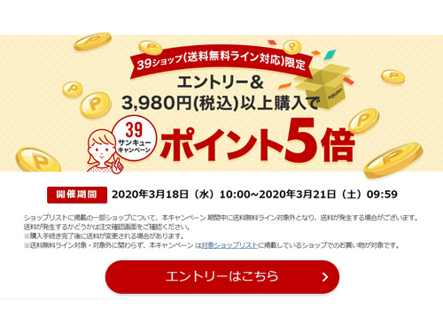 出店者向けには、今回の施策名は「共通の送料込みライン」としているが、ユーザー向けには「送料無料ライン」と表記している。「送料無料ライン」の対象店舗の総称を「39(サンキュー)ショップ」と名付け、商品検索で対象商品を絞り込む機能の提供も開始した。