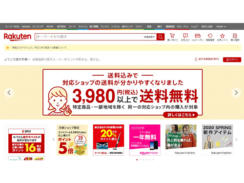 楽天は3月18日、対象店舗で3980円以上購入した注文において送料を無料にする施策「送料無料ライン」を開始した。対象店舗の利用者にポイントを5倍付与するキャンペーンを展開。3月12日には、導入店舗の送料の一部を支援する「安心サポートプログラム」の内容を発表した。ユーザーの利用や、店舗の導入に特典を付け、双方の参加促進を図る。