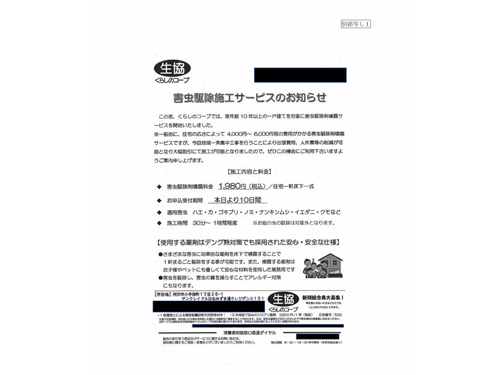 埼玉県の発表によると同生協は、「チラシを見ていただいたでしょうか」「害虫駆除の案内で来ました」「生協です」などと告げるのみで、組合の名称を明らかにしていなかった。