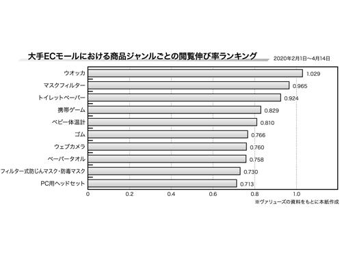 ウェブマーケティング調査やコンサルティングサービスを提供するヴァリューズ(本社東京都、辻本秀幸社長)はこのほど、新型コロナウイルス感染拡大に伴う消費者行動の変化について調査した。大手ECモールにおける商品ページの閲覧数は、マスクなどの生活用品だけでなく、酒や携帯ゲームといった嗜好(しこう)品が大幅に伸長した。首位のウオッカの閲覧数は、コロナ発生以前と比較し10倍以上となった。ウオッカの一部銘柄は、消毒の代用品として注目されたことが影響しているようだ。