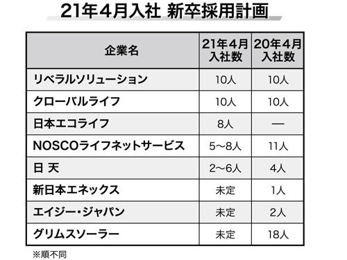 本紙が調査した21年4月に入社する新卒採用を実施する住設訪販企業は5社で、3社が未定となった=別表参照。未定とした企業は、コロナ禍の推移を踏まえた上で判断していくようだ。