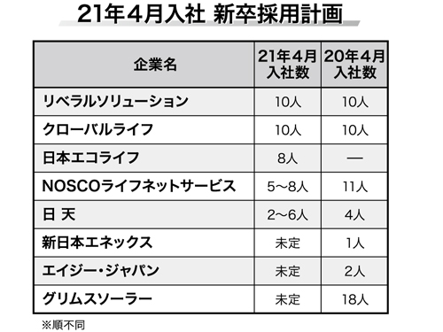 太陽光発電をテレアポ訪販で展開するグローバルライフ(本社東京都、伊東健太郎社長)は、新卒採用について、「学生側の姿勢が変わっており、意欲のある学生の申し込みが多いと感じる」(伊東社長)と話す。20年4月入社の新卒採用は10人。21年4月入社も同様に10人前後とする予定だ。