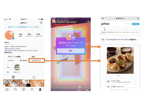 インスタグラムのユーザーがブランドのアカウントや投稿を閲覧し、スタンプやアクションボタンをタップすると、「giftee」のeギフト販売ページやブランドのeギフト販売サイトが表示される。ユーザーは、任意のチケットを選択するとeギフトを購入できる。