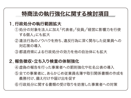 特商法を改正する上で執行強化の是非は重要な論点の一つ。執行を担う消費者庁や都道府県は悪質商法の手口が複雑・巧妙化する中、現行法では執行が困難な事例が増えているとして、法改正の必要性を主張している。