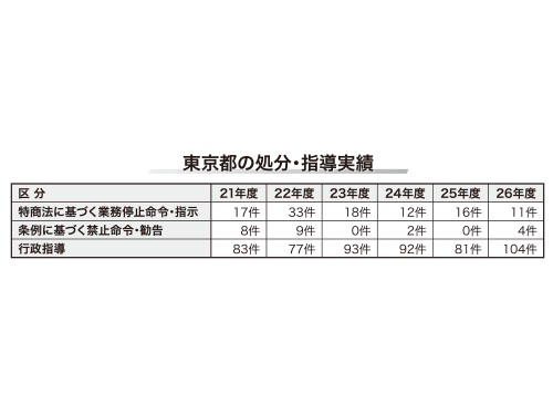 東京都/行政指導が過去最多の104件に/特商法と都条例に基づく処分実績を公表