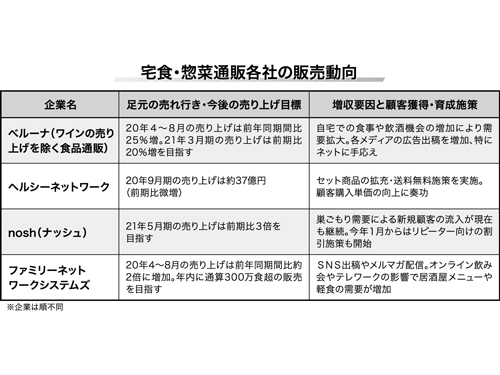 弁当や総菜の通販を手掛ける主要各社では、足元の売り上げが好調に推移している。緊急事態宣言があった4月ごろから新規顧客が拡大し、現在まで勢いを落とさずに増収が続いている。今期の売り上げが前期比2~3倍を見込む企業も複数あった。各社はウェブマーケティングを活用し、デジタル広告や公式アプリによる周知で新規顧客を獲得している。通販売り上げの推移や、今後の計画、リピーター育成の施策をまとめた。
