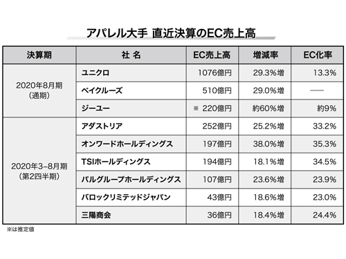 アパレル大手の通期決算や第2四半期(中間期)決算の発表が出そろう中、EC売上高の2桁成長が続出している。20%台は当たり前で、60%増を記録する企業もある。アパレル最大手のユニクロ(本社山口県、柳井正社長)は20年8月期、初めてEC売上高が1000億円を突破した。成長率の高い企業を分析すると、自社ECサイトの売上比率が高いことが分かった。