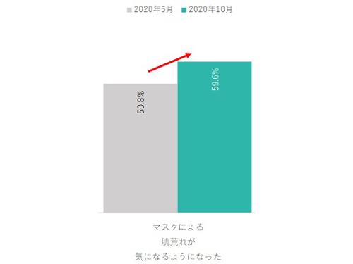 スキンケアの支出が「増えた」または「とても増えた」と回答した人は42.7%。スキンケアは、関心の高さ・支出額ともに、前回調査を上回った。また、「マスクによる肌荒れが気になるようになった」と回答した人は59.6%だった。
