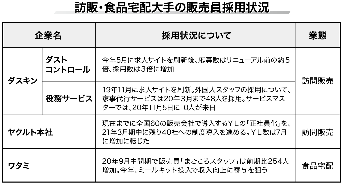 業務委託契約を中心とした販売員を抱える大手訪販企業や食品宅配企業では、新型コロナウイルスの影響を境に人材採用の環境が上向きの基調にある。ヤクルト本社は、離職率が大幅に改善したほか、新規採用も進んだことで今年7月に販売員「ヤクルトレディ(YL)」の数が増加に転じた。ダスキンでは、求人のウェブサイトを刷新。ダストコントロールなどの事業において、応募数がリニューアル前の約5倍、採用数は約3倍に増えた。業務委託契約の販売員が多い中で、正社員やパートといった雇用形態に応じた働き方を提供して、応募者の多様なニーズを取り込んでいる。