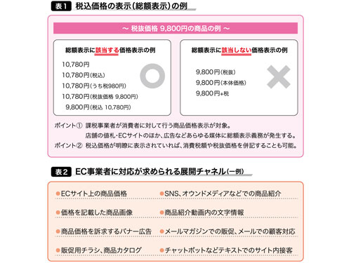 本紙では関係省庁に取材を行い、適切とされる「総額表示」の例(別表(1)参照)と、事業者に対応が求められると想定されるチャネル(別表(2)参照)についてそれぞれまとめた。