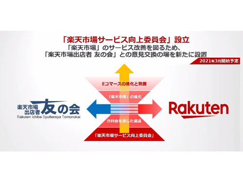 「楽天市場サービス向上委員会」は、「楽天市場」のサービス改善を図るために、出店者の任意団体である「楽天市場出店者 友の会」と意見交換を行う場を設ける。議題に応じて分科会を設け、ディスカッションを行う予定だ。