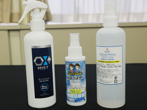 オトギノは「OX MIST」、マトファー・ジャパンは「微弱酸性次亜塩素酸水 アクアトロン MATFER JAPAN」、遊笑は「コロバスター」と称するスプレー型の商品に措置命令の対象となった表示をしていた。