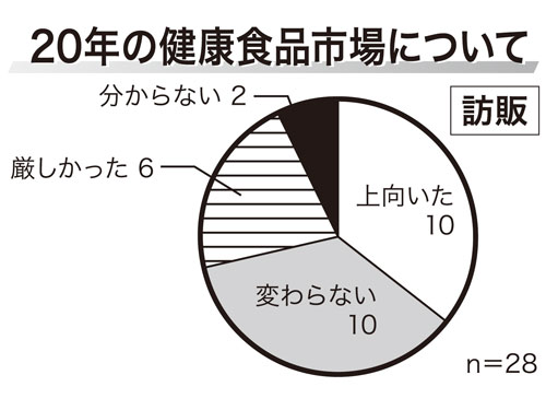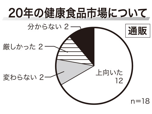 通販では、20年の健康食品市場について、18社中12社(66%)が「上向いた」と回答した(表を参照)。「コロナ禍で健康志向が高まった」(キューサイ)「外出自粛によるECでの購入機会が増加した」(ディーエイチシー)といった声が寄せられた。