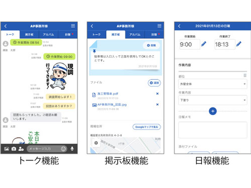 直販体制で事業展開している中で、現場の塗装事業者などの声を、直接聞く機会が多かったことがアプリ開発につながった。アプリには「トーク機能」「掲示板機能」「アルバム機能」「日報機能」「報告書作成機能」があり、現場管理に必要なことをそろえている。特に、現場監督者には効果的に管理が行えるとしている。アプリ導入後、利用ユーザーやデータ容量の増加によって、追加費用はなく無制限で使える。最大2カ月間は、無料で利用できる期間も設けている。