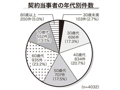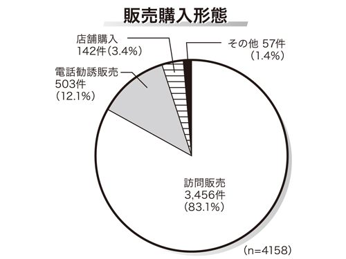 契約当事者を地域別で分けると、東海が778件と最も多く、南関東が715件。九州北部は621件、近畿では556件だった。販売の購入形態別では、訪問販売が3456件と最も多く、電話勧誘販売が503件、店舗購入が142件となっている。