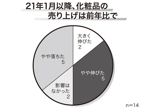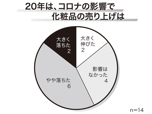 本紙がこのほどまとめた「21年版訪問販売化粧品売上高調査」では、ランキング化した68社の合計売上高が3556億7500万円となった。前年と比較可能な27社で算出した実質成長率は、2.1%のマイナス成長となった。上位50社合計の売上高は前年比16.7%減の3467億1800万円となった。最大手のポーラを中心とした、化粧品のサロン販売を手掛ける企業へのコロナの影響が、色濃く反映された。一方で、オンライン会議システムの導入などDX活用を推進することにより、コロナ禍の中、増収を確保した企業も複数あった。
