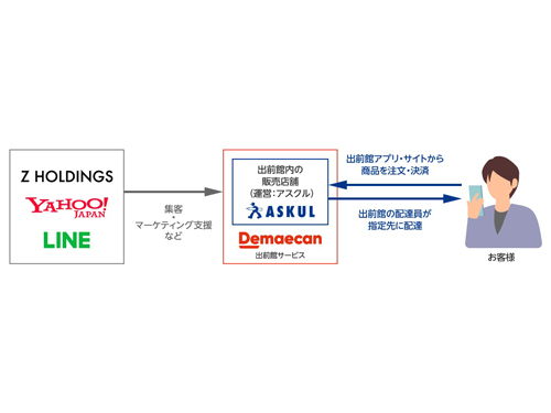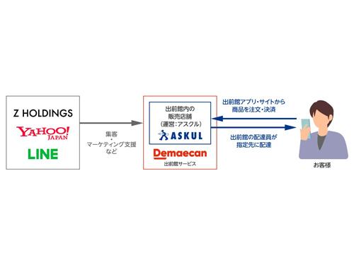 対象エリアのユーザーは、出前館のサービス上で、アスクルが販売する約300種類の商品を、最短15分で受け取ることができる。出前館の配達員は注文を受けた後、都内の専用倉庫で商品を受け取り、自転車やバイクで指定された配達先に届ける。ZHDやヤフー、LINEは、集客やポイント施策などのマーケティング活動をサポートする。