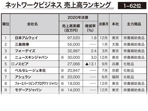 【ネットワークビジネス主宰企業 2020年度 売上高ランキング】 栄養補助食品が市場をけん引/124社の合計売上高は6264億円に(2021年8月5日・12日夏季特大号)