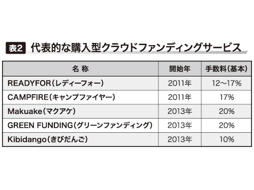 国内では「READYFOR(レディーフォー)」や「CAMPFIRE(キャンプファイヤー)」を先駆けに、11年以降多くの購入型CFサイトが開設されている。主なCFサイトは別表(2)の通り。