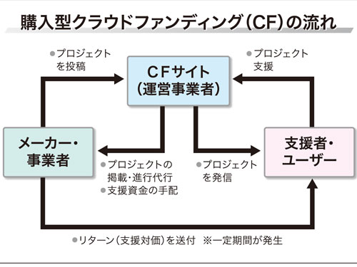 事業者はプロジェクト掲載・進行の手数料として支援総額の一部をCFサイト側に支払う。取引の流れは別表(1)の通り。ユーザーとの窓口を担うCFサイトは、ECモールに近い役割を持つ。