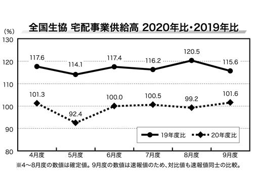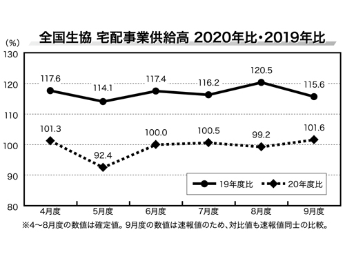 日本生活協同組合連合会(本部東京都、土屋敏夫会長)の21年4―9月期(中間期)における宅配事業の供給高(売上高)は前年同期比0.8%減だった。コロナ禍前の19年度と比べても16.9%増で5月以降は初めての緊急事態宣言の反動があるものの、6月以降は堅調に推移。冷凍米飯や冷凍めん、乳幼児向け商品などの在宅需要やランチ需要を捉えたプライベートブランド(PB)冷凍食品関連の商品の販売が好調だという。