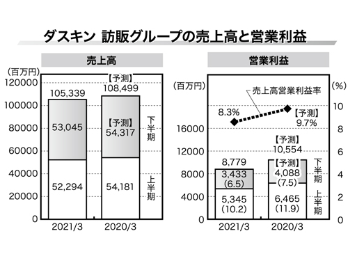 22年3月期の訪販グループの予想売上高は前期比2.4%増となる1084億9900万円、営業利益は同19.1%増の105億5400万円を見込む。