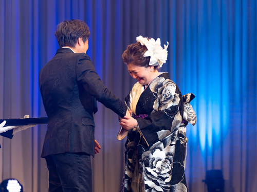 一部の表彰が終了したあとは、特別ゲストとして、お笑いタレントの山田邦子が登壇。約1時間、漫談や自身が経験した乳がんのことなどを、赤裸々に語った。山田邦子は、松本社長との付き合いが長いこともあり、会の終盤には、二人で壇上に上がり、それぞれの思いをぶつけ合うシーンもあった。