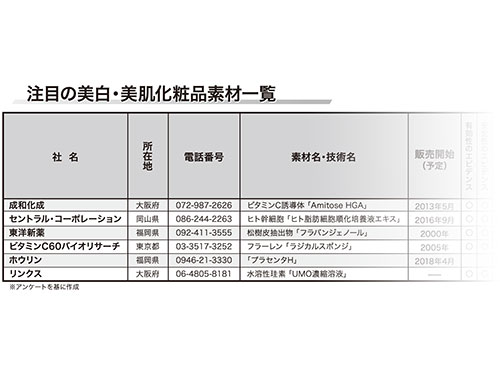 化粧品にも科学的裏付けが求められる時代が、間違いなく到来している。化粧品を供給する企業は、生産能力の向上や、品質の改善に加えて、研究・開発に多くの力を割くようになってきている。化粧品分野の研究・開発が進展するにつれ、これまで知られなかった、美白・美肌のメカニズムも次々と明らかになっている。幹細胞や遺伝子に着目した、最新鋭のメカニズムを備えた化粧品素材も多く市場に登場するようになっている。一方で、保湿を軸とした化粧品素材も、引き続き根強い人気を誇っている。ユーザーの支持を集める美白・美肌化粧品を紹介する。