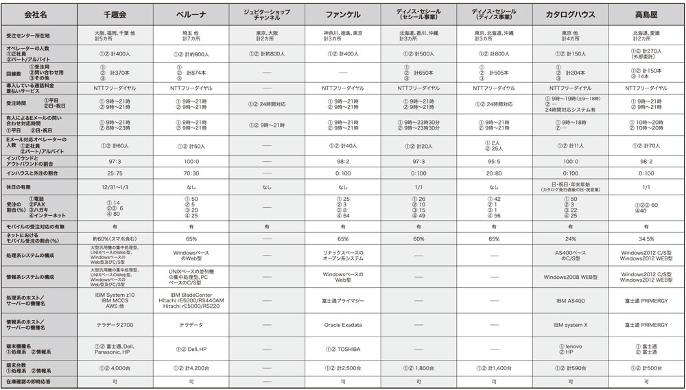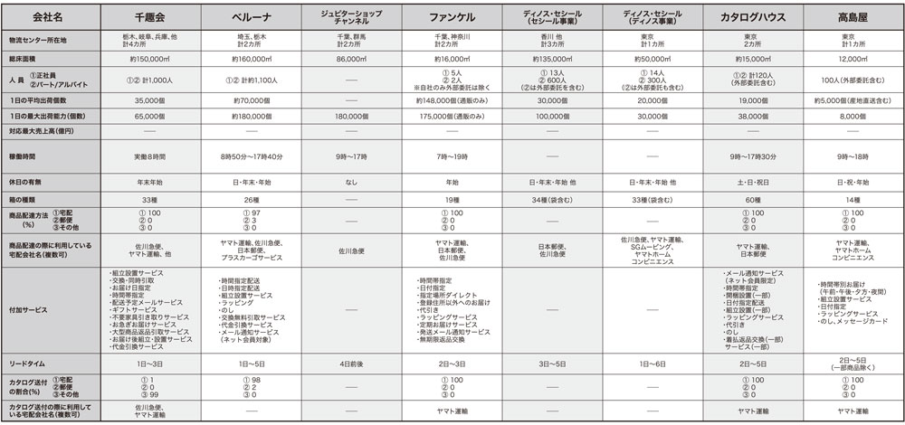 日本流通産業新聞は4月、主要通販事業者における最新のフルフィルメント状況を調査した「第27回通販フルフィルメント調査」を実施した。受注分野では前回調査に引き続き、インターネットによる受注比率の増加が目立つ。さらに受注手段の割合に定期販売を回答する事例がみられた。物流分野では配送委託先を増やす事例がいくつかみられたほか、売上高の減少で、出荷個数が減少する事例があった。回答企業は総合通販を中心とした7社。個人向け通販を実施していないスクロールは、生協ルートにおける情報開示となるため、今回調査から回答を見送ってきた。