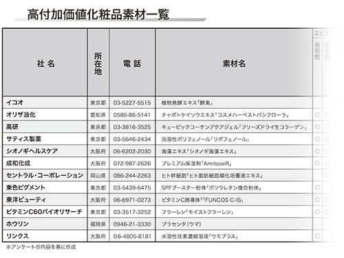 通販においても、訪販においても、化粧品を開発する上での最重要課題は「高付加価値化」といえるだろう。いまや、化粧品は100円ショップで買える時代。付加価値を実感できる化粧品を開発しなければ、消費者は見向きもしないだろう。付加価値と一口に言っても、体感性、剤形、デザイン、使用感、品質、エビデンスなどなど、実に多様なアプローチがある。化粧品の高付加価値化をサポートできる企業を紹介する。
