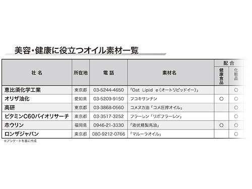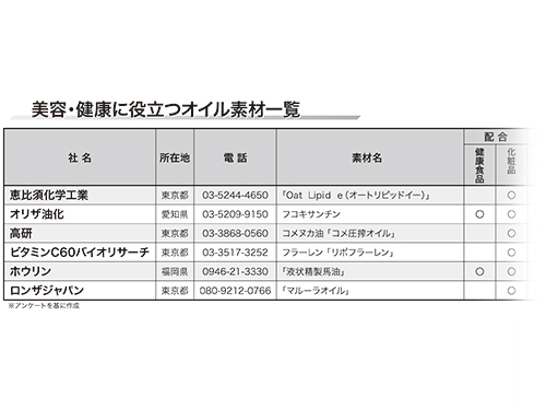 「健康に良い油」「美容に良い油」が注目を集めている。オイルは、食品として摂取したり、化粧品として塗布したりすることにより、さまざまな効果を発揮する。さまざまなオイル素材が紹介されるようになっており、消費者にとっての選択肢は広がっている。「機能性」はもちろんだが、「ストーリー性」や「イメージの良さ」もオイル選びの重要なポイントになる。化粧品では塗布時の「使用感・触感」も重要。食品においては、「味や風味」も当然問われることになる。酸化・劣化がしやすいオイルにおいては、「品質」も重要なポイントだ。消費者から選ばれる資格を持った美容・健康オイル素材を紹介する。