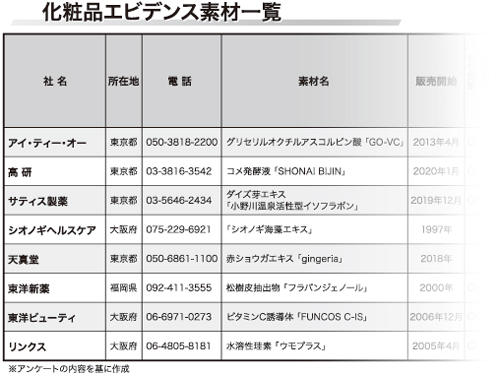 化粧品素材供給各社でエビデンスの蓄積が進んでいる。ヒト試験で効能が確認された素材も多く登場している。効能のメカニズムの解明も行われるようになっている。抗シワ、美白、たるみ改善、皮脂抑制、毛穴対策、テカリ対策など、化粧品に求められる効能は多様化している。効能が科学的に実証された、確かな化粧品素材が求められている。