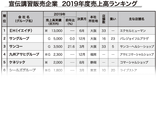 本紙は2019年度(19年4月~20年3月の間に迎えた決算期が対象)の宣伝講習販売企業の売上高を集計し、ランキング化した。本紙が推定した売り上げを含めた、18年度との比較可能な20社合計の売上高は、前年度よりも11ポイント減の376億8000万円だった。業界首位のEHの落ち込みが目立ち、店舗数の減少に伴い、20年6月期で100億円を維持できるかが焦点となる。コロナ禍で、店舗を休業した企業が多く、20年度の通期業績に大きな影響を与えそうだ。