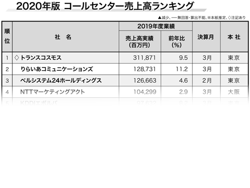 1位のトランスコスモスは、国内外でのサービス受注が堅調に増加した。2位のりらいあコミュニケーションズは、既存事業の拡大と、金融・公益向けの大型スポット業務の受注増加が2桁増収につながった。