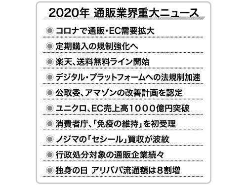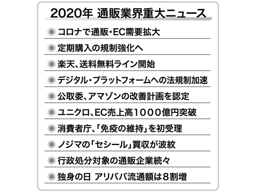 今年の通販業界を振り返る上でも、コロナ禍が与えた影響を避けては通れない。社会のありとあらゆる「当然」が覆される中、無店舗・非対面を前提とした通販・ECの需要は急拡大した。業績を伸ばす事業者が多くを占め、混迷を極めるコロナ禍において「台風の目」とも呼べる業界だ。市場の拡大に比例するように、消費者トラブルに起因する事業者への規制強化や、行政処分の動きも目立つ1年だった。「新しい生活様式」のもと、21年以降も業界が果たすべき社会的役割と責任が増していくことは間違いない。