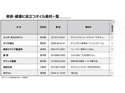 化粧品や健康食品に配合することで、美容・健康効果を発揮するオイルが、引き続き高い人気を誇っている。コロナ禍で、保湿ケアの必要性が高まる中、化粧品として使用する保湿オイルのニーズも高まっているようだ。各社とも機能性や安全性のエビデンスを取得するケースが増えている。機能性表示食品化の実績を持つオイル素材も増えている。一方で、SDGsに対応した、サステイナブルなコンセプトを持つオイル素材も出てきている。注目のオイル素材を紹介する。